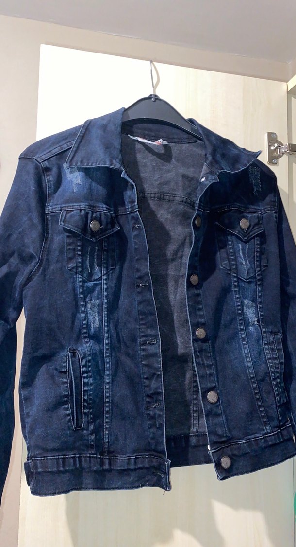 Düğmeli, yakalı ve uzun kollu, normal boyda, lacivert kot kumaştan yapılmış, günlük kullanıma uygun, dar kesim kadın kot ceketi.