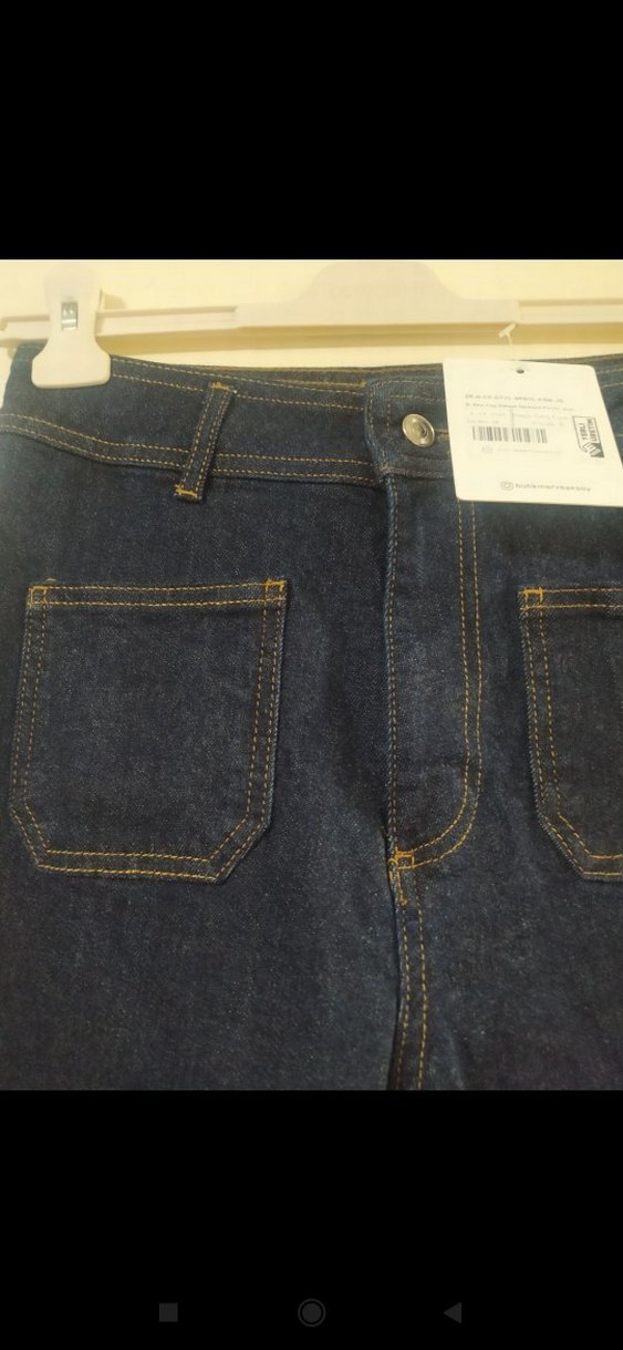 Düğmeli kapama ve ön ceplere sahip, lacivert renkte, normal boyda,İspanyol paça kadın kot pantolon. Günlük kullanıma uygundur.