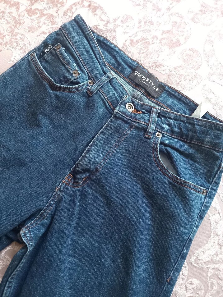 Düğmeli, lacivert denim kot pantolonlar, rahat bir loose fit ve normal boy ile normcore tarzını yansıtıyor. Günlük kullanım için sade ve desen içermeyen tasarım. 1 kez kullanıldı yeniden farksız