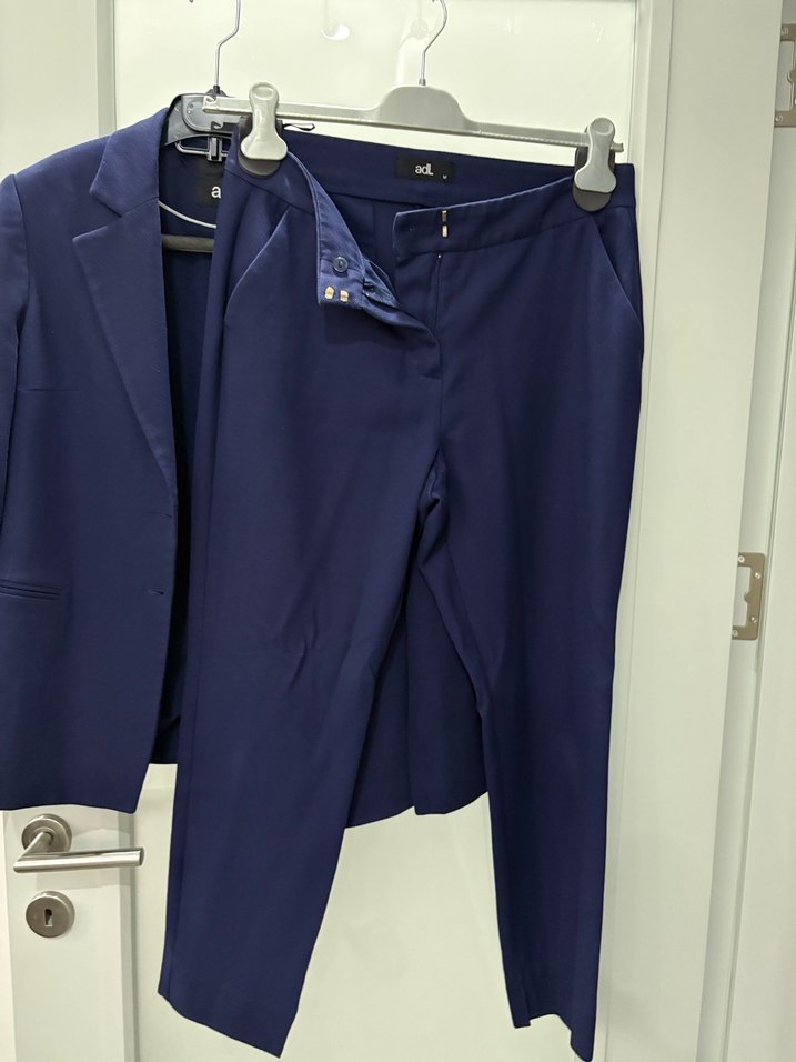 Düğmeli, normal boy midi lacivert kadın kumaş pantolon, ipeksi dokuda ve regular fit kesimde. Ofis kullanımı için uygundur ve normcore tarzındadır.