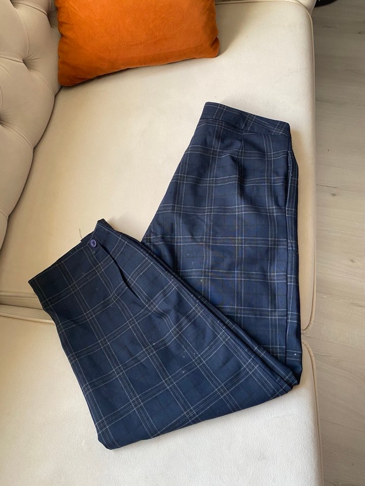Düğmeli ön kısmı ve koyu mavi renkli ince kareli deseniyle kadınlar için regular fit kumaş pantolon. Sentetik kumaştan, midi boy ve ofis kullanımı için uygun.