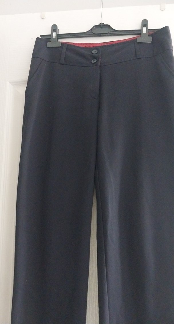 lacivert renkli, düğmeli ve midi boyda, normal kesim kadın kumaş pantolon. Ofis kullanımı için uygundur ve ipeksi dokusuyla konfor sağlar.