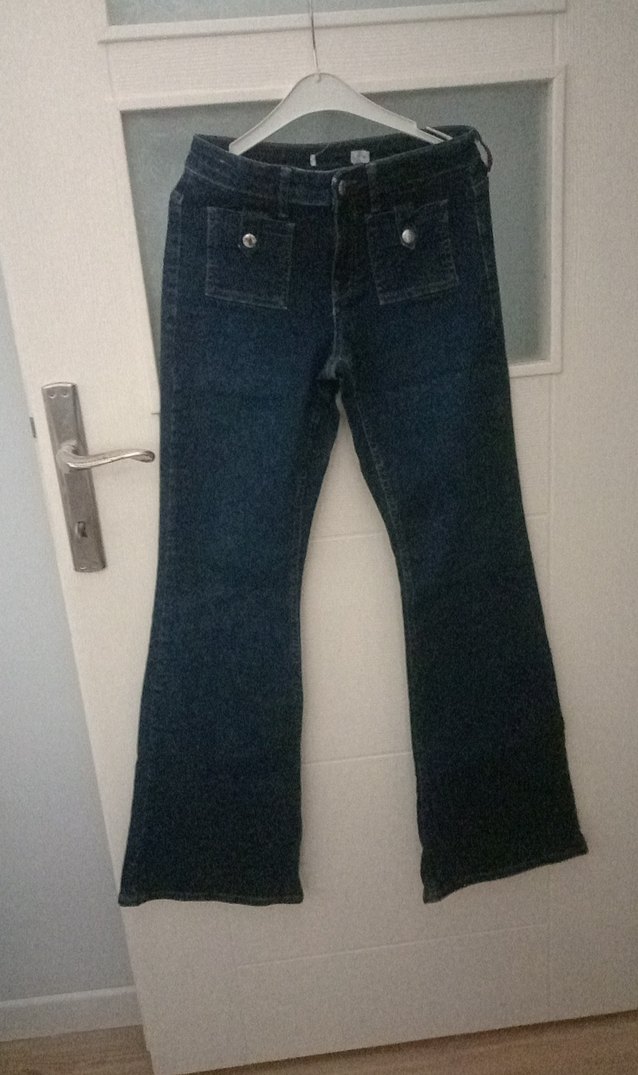 Düğmeli cep detaylı, bol kesim lacivert midi kot pantolon, gündelik rahat stil için uygundur.