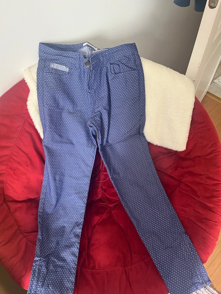 Düğmeli ve midi boy lacivert kot pantolon, regular fit kesimle gündelik sokak stili için uygundur. Hafif puantiyeli deseni vardır.