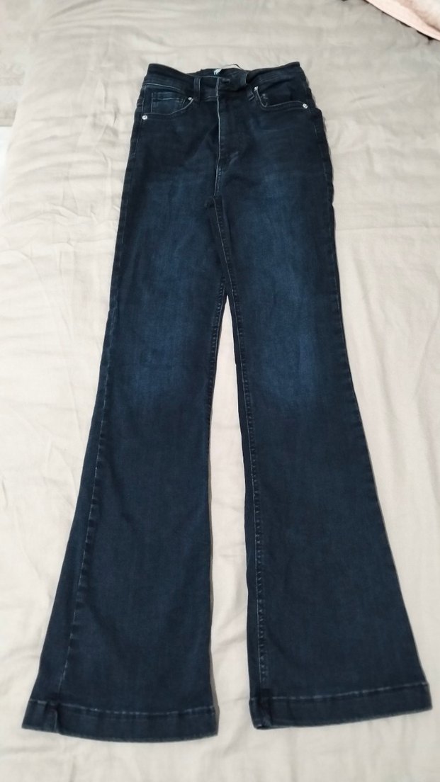Düğmeli ön kısmı ve normal midi boyu ile bol kesim lacivert kot pantolon, günlük rahat kullanım için uygundur.