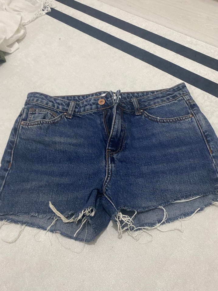 Lacivert renkli, düğmeli, bol kesim kısa jean şort. Alt kısmı yırtık detaylı, günlük rahat sokak stili için uygun.