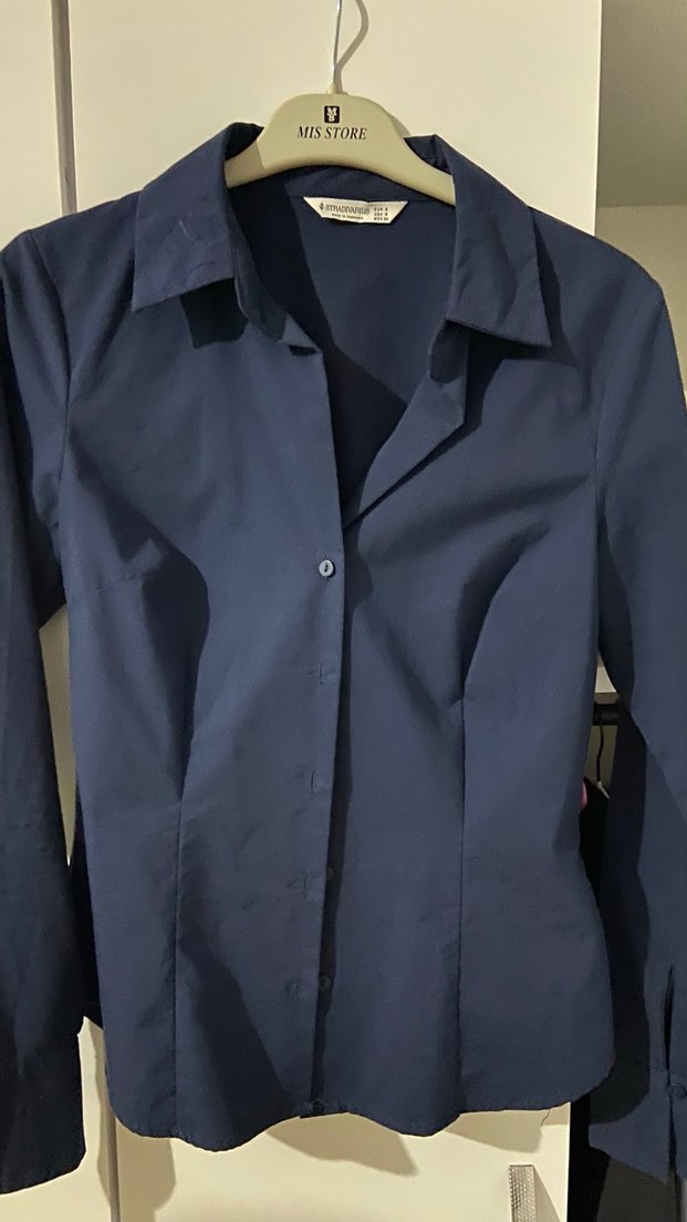 Lacivert düğmeli kadın gömleği, kesimli yakalı ve uzun kolludur. Ofis için uygun, düz ve sade tarzda, sentetik kumaştan midi boyda üretilmiştir.