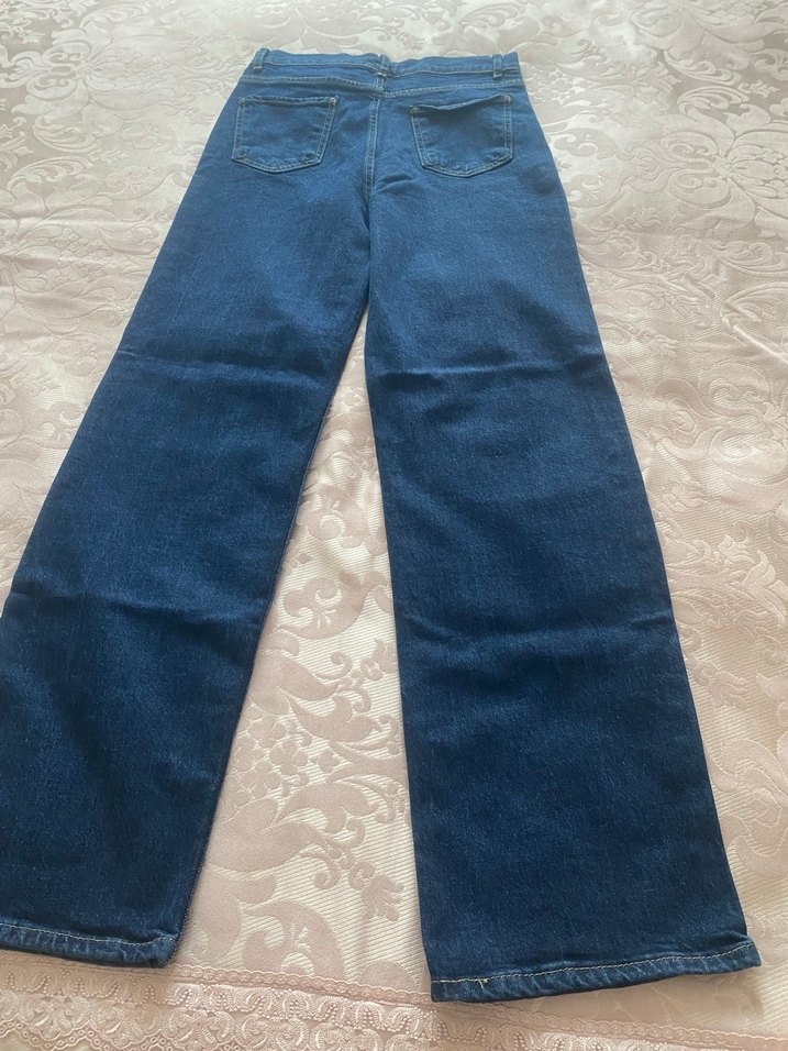 Düz lacivert renkte, düğmeli ve midi boyda kadın denim pantolon. Rahat kesimiyle günlük kullanıma uygundur. Parlak kumaş ve desen yoktur.