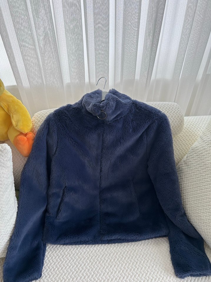 yüksek yakalı ve fitted kesim lacivert kadın ceket. Yumuşak ve sıcak kumaştan üretilmiş, uzun kollu ve normal boyda rahat bir parça. Günlük kullanıma uygundur.