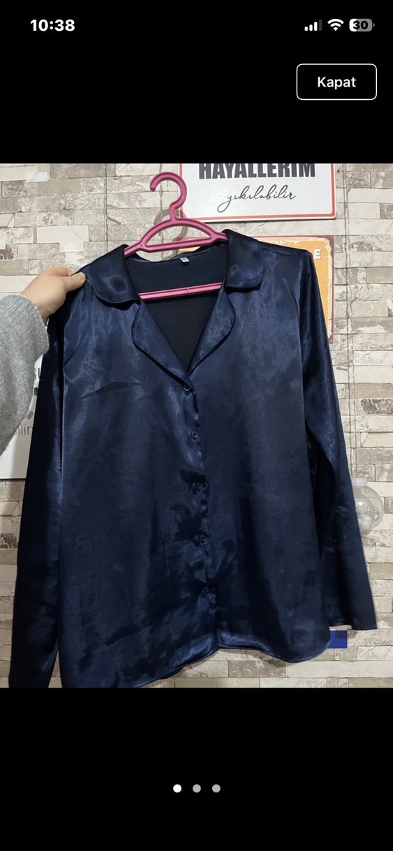 Düğmeli önü, kesik yakası ve uzun kollu saten kumaştan yapılmış lacivert gömlek. Günlük kullanıma uygun rahat kesim ve Paris sokak modası tarzında.
