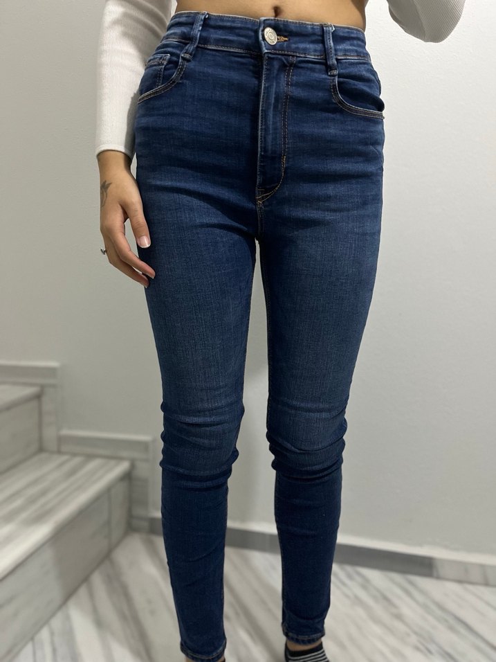 Düğmeli ve normal boyda, denimden üretilmiş lacivert kadın skinny jean. Günlük kullanıma uygun, rahat ve şık bir sokak stili ürünü.