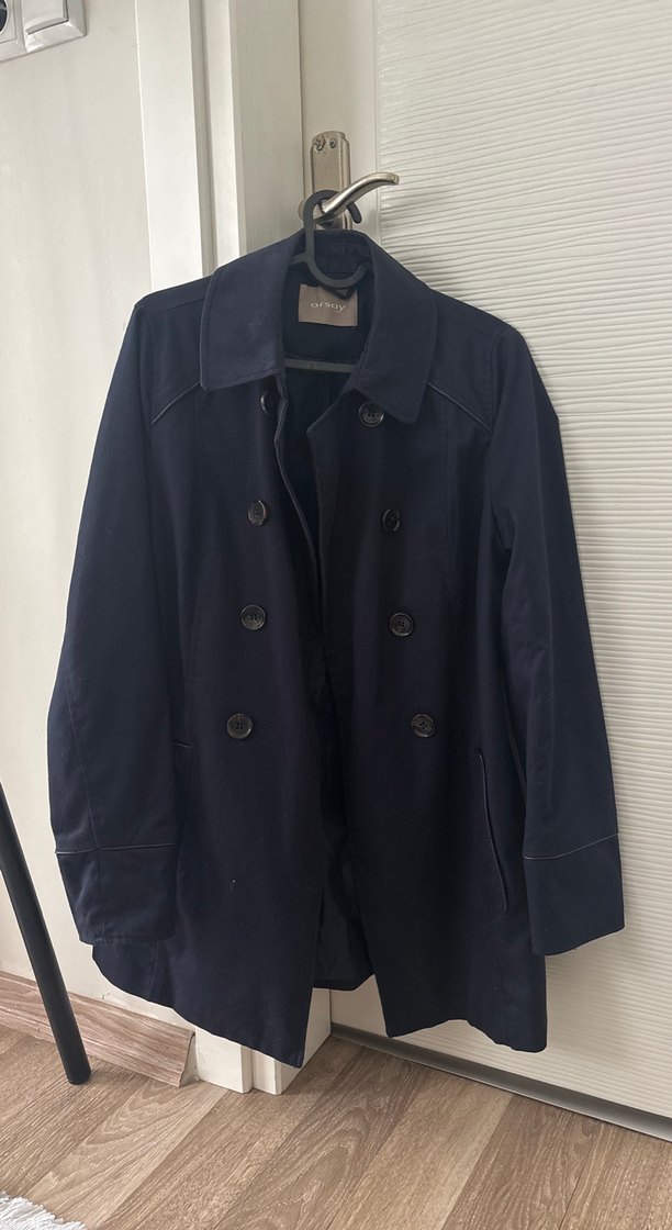 Lacivert renkte, düğmeli ve notlu yakalı kadın trençkot.