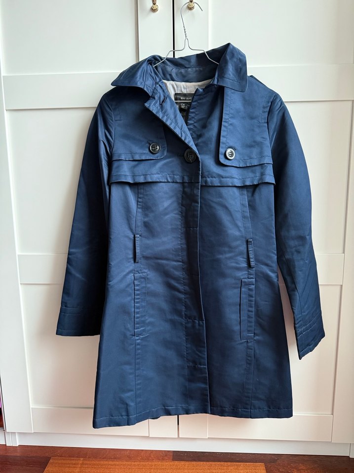 Düğmeli, midi boy, normal kesim ve uzun kollu kadın trençkot. Parlak lacivert denim kumaştan, klasik kesim yakalı ve düğmeli kapamalı. Paris tarzı, sade ve günlük kullanıma uygun.