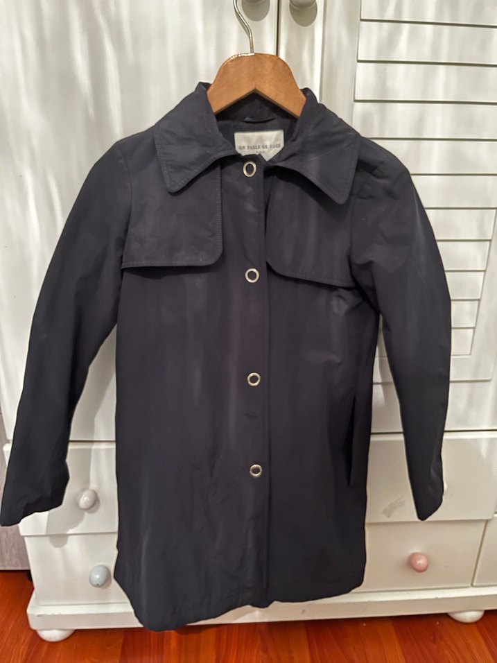 Uzun kollu, düğmeli lacivert kadın trençkot. Normal kesim, ipeksi dokulu ve Paris tarzı günlük kullanım için uygundur.