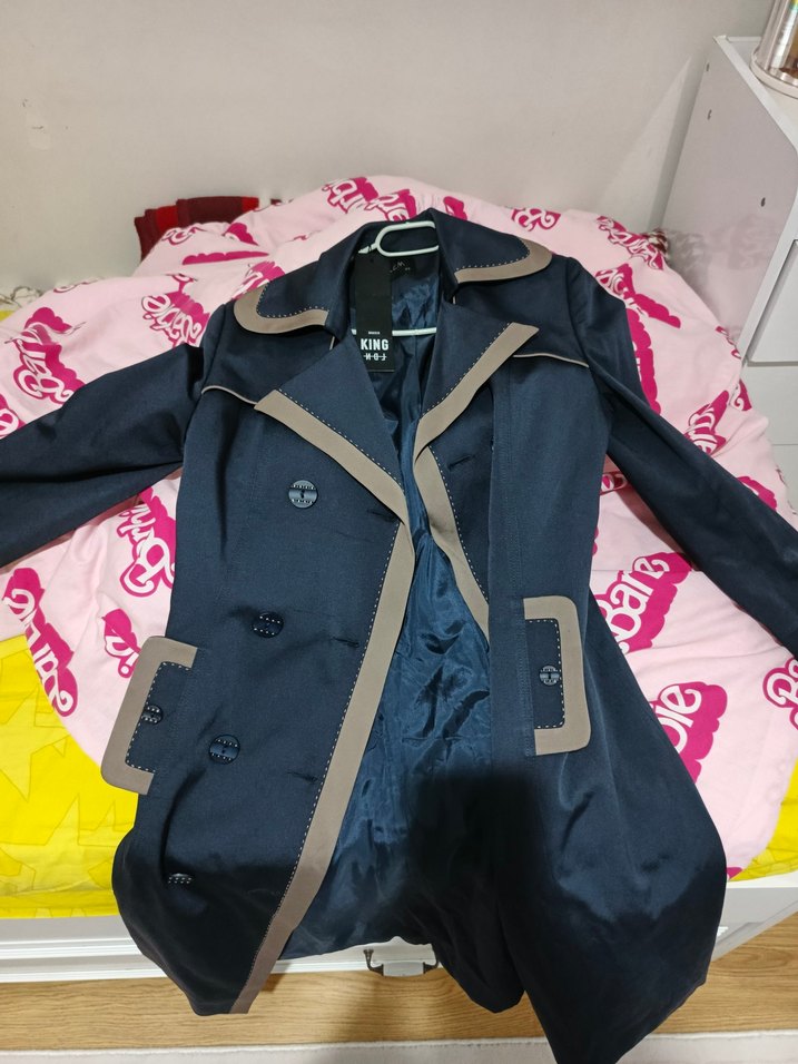 Düğmeli ve yakalı, normal boy midi trençkot. Lacivert renkli, uzun kollu ve sentetik kumaştan üretilmiştir. Günlük ve iş stiline uygundur.