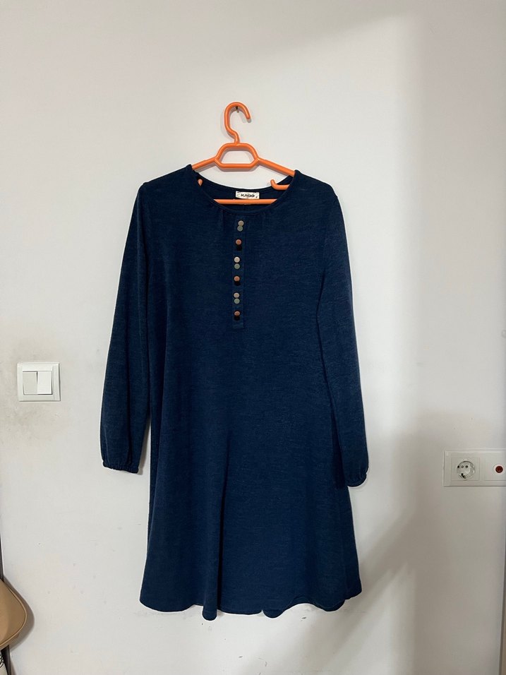 Lacivert yün elbise, uzun kollu, yuvarlak yakalı ve önünde düğme detaylıdır. Bol kesim ve midi boydadır, minimalist günlük stil için uygundur.
