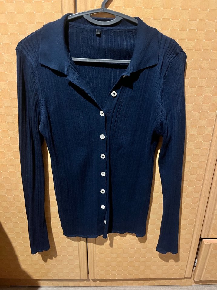 Lacivert triko kumaştan, uzun kollu, yakalı ve düğmeli ön tasarıma sahip, normal boyda ve vücuda oturan kadın kazak. Günlük kullanıma uygun.