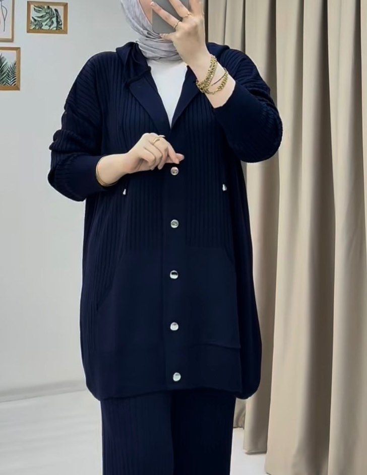 Lacivert renkli, düğmeli ve uzun kesim kadın triko takım. Notched lapel yakalı, düz desenli ve rahat kesimdir. Günlük iş stiline uygundur.