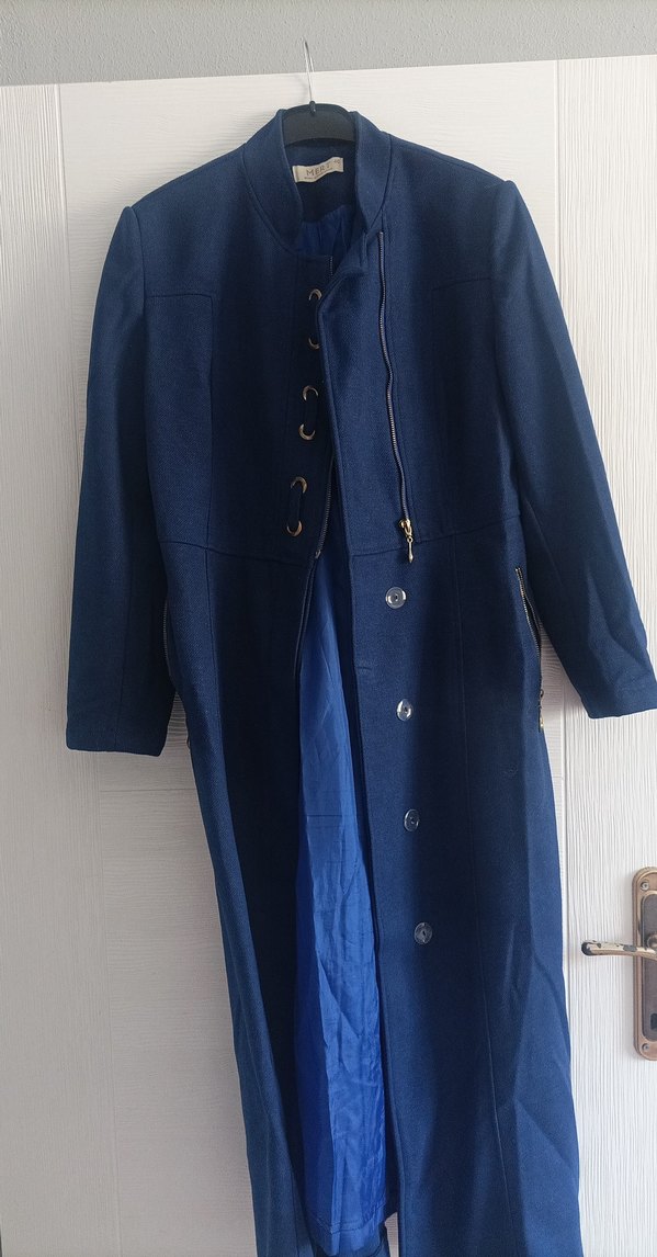Düğmeli ön kısmı ve kesimli yakasıyla lacivert uzun kadın kaban. Kot kumaştan, uzun kollu ve ofis için uygun normal kesim.