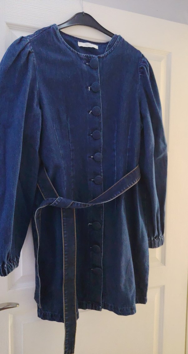 Lacivert renkte, düğmeli, uzun kollu ve uzun boylu, kesimli kadın denim ceketi ve elbşse olarak kullanılır. Bohem tarzı ve Paris esintili, günlük şıklık için uygundur. Rengi koyu telefonumdan kaynaklı açık çıkıyor sorunu yok giyilmesi bile
