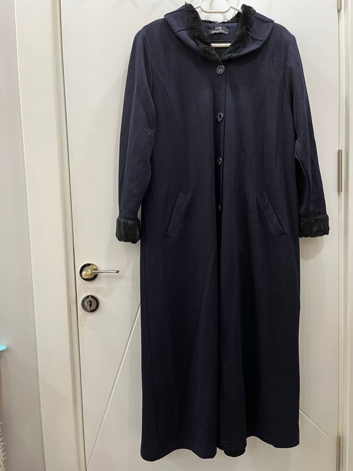 Düğmeli, uzun kollu, lacivert kadın kaban. Gevşek kesimli, yumuşak ve sıcak kumaştan, günlük kullanım için uygundur. Çok kalın değil.