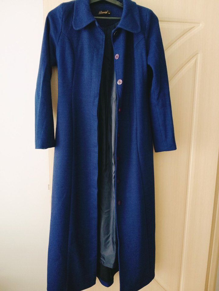 Düğmeli, uzun kadın kaban, yumuşak ve sıcak kumaştan, koyu mavi renkte. Notched yaka ve uzun kollu, ofis için uygun, sade ve şık tasarım.