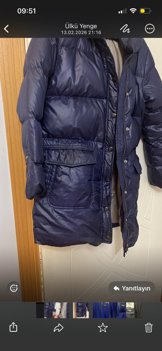Düğmeli, yakalı ve uzun kollu lacivert kışlık mont. Sentetik kumaştan, rahat ve şık günlük kullanım için uygun. ❄️