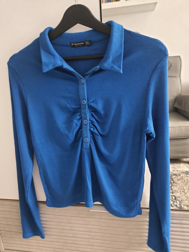 Düğmeli ön kısmı ve yakalı tasarımıyla, fitted kesimde uzun kollu lacivert kadın gömlek. Kadifemsi dokulu sentetik kumaştan, günlük şıklık için uygun.