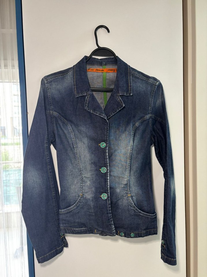 Lacivert kot ceket, düğmeli ve notlu yaka detayına sahiptir. Uzun kollu, normal kesimdir. Günlük kullanıma uygundur. Marka temsilidir. #ceket #vintage #kotceket #bluz #mont #pantolon