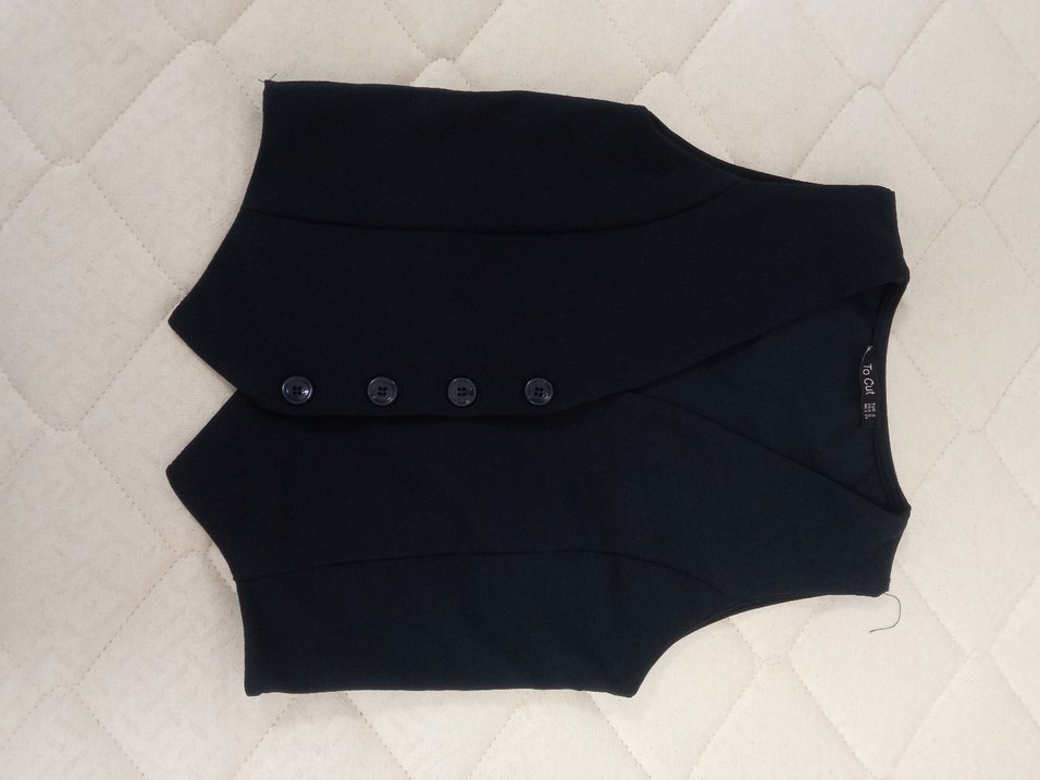 Düğmeli ön kısmı ve kesik yakası olan, dar kesim lacivert kolsuz yelek. İş ortamı için uygun, yumuşak ve sıcak kumaştan yapılmıştır.