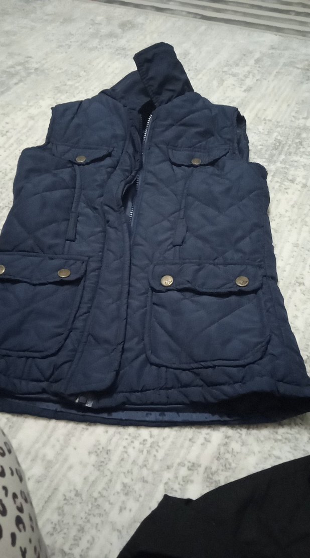 Düğmeli, lacivert renkte, kolsuz ve yakalı kadın yeleği. İnce kesimli, midi boyda ve rahat kumaştan günlük kullanıma uygun.