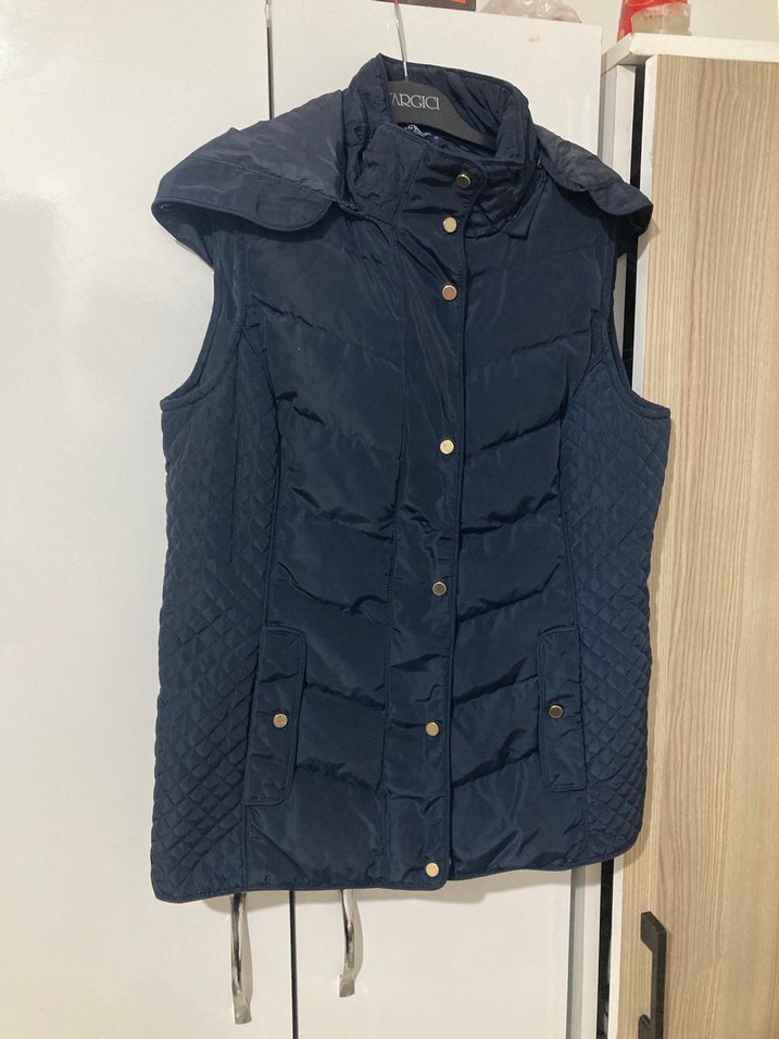 Düğmeli, yakalı, kolsuz lacivert yelek mont. Rahat kesimi ve sokak stiline uygun tasarımıyla günlük kullanıma uygundur.