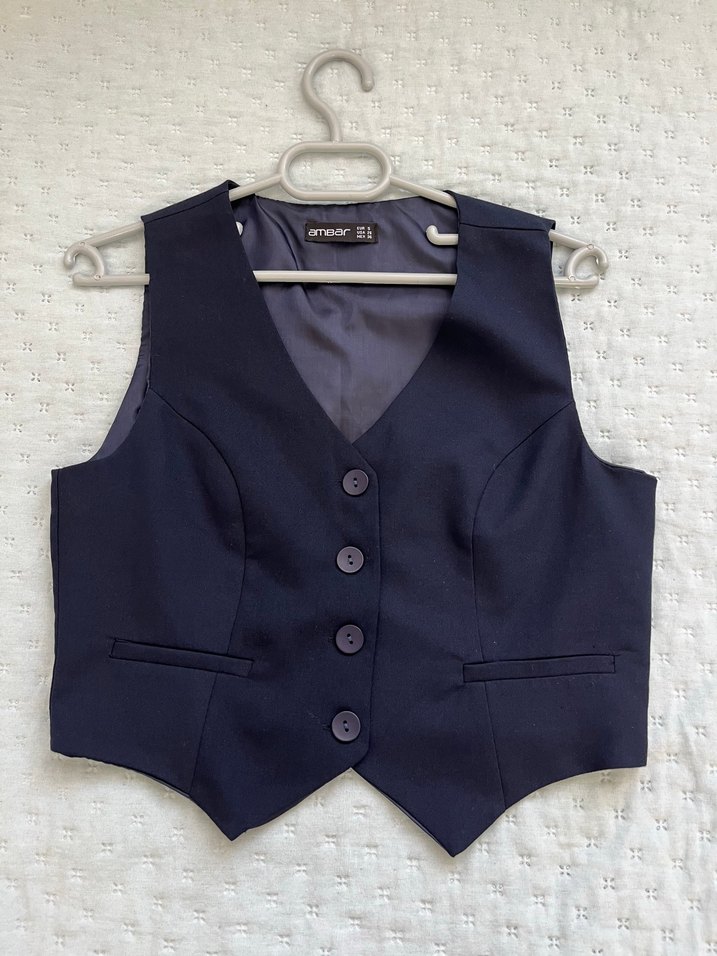 çok az giyildi pantolonda pens mevcut sökülebilir. Düğmeli, kruvaze yakalı lacivert kadın yelek. Ofis için uygun, vücuda oturan kesim ve yumuşak sentetik kumaş. Beden S.