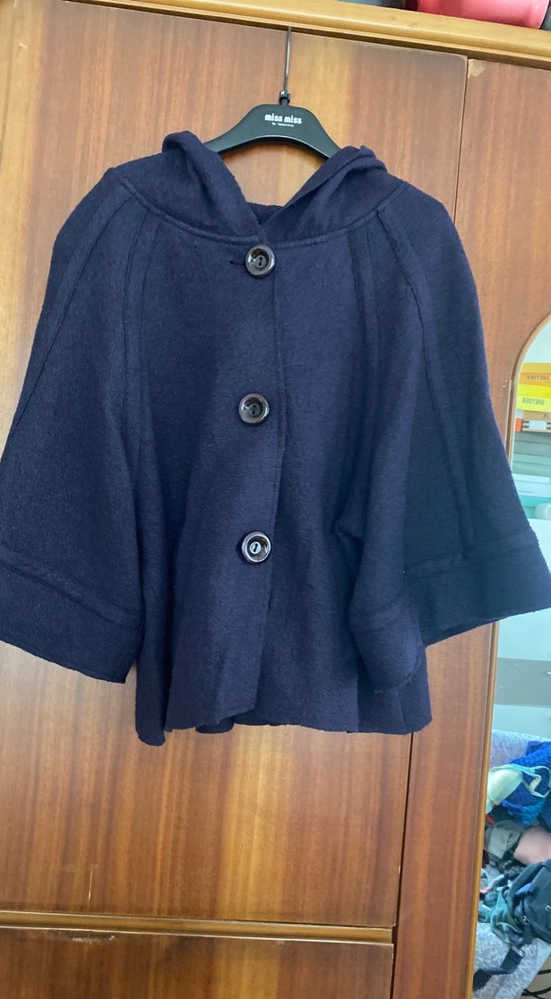 Lacivert yün ceketin düğmeli kapaması, keskin yakası ve uzun kolları vardır. Salaş kesimli, midi boy ve ofis için şık bir tercihtir.