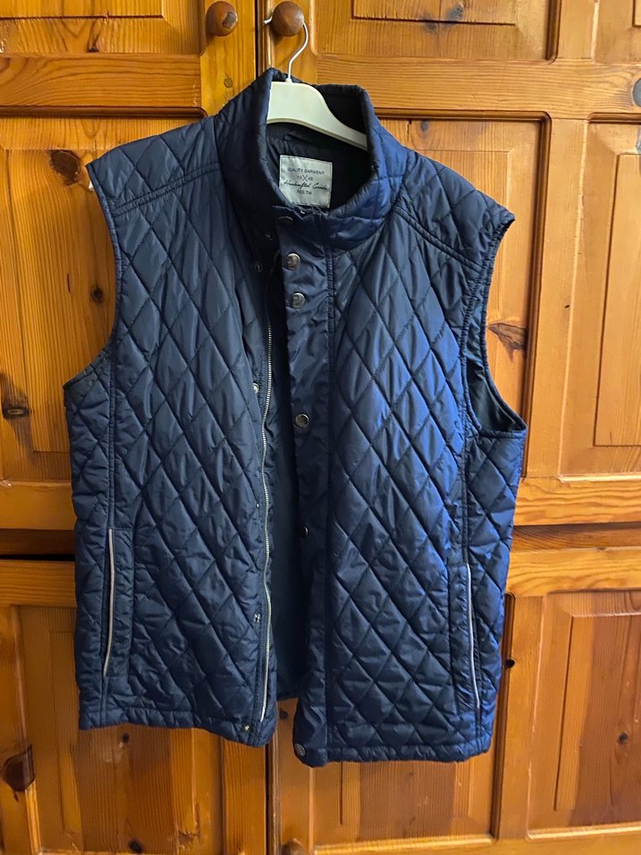 Düğmeli, kapitone lacivert erkek yelek, kolsuz ve normal kesim. Günlük kullanım için uygun, klasik yakalı ve rahat tarzda.