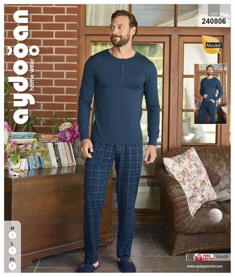 AYDOĞAN 240806 ERKEK MODAL PATLI U.KOL PJ TKM AYDOĞAN Düğmeli uzun kollu, yuvarlak yakalı lacivert üst ve kareli midi boy pantolonlu erkek pijama takımı. Rahat kesimli, gündelik kullanıma uygun.