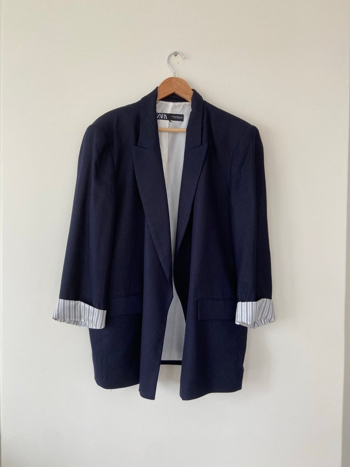 Lacivert keten kumaştan, düğmeli ve uzun kollu, normal kesim midi uzunluğunda kadın blazer. Ofis ve sokak stiline uygun, klasik ve şık görünümlü.