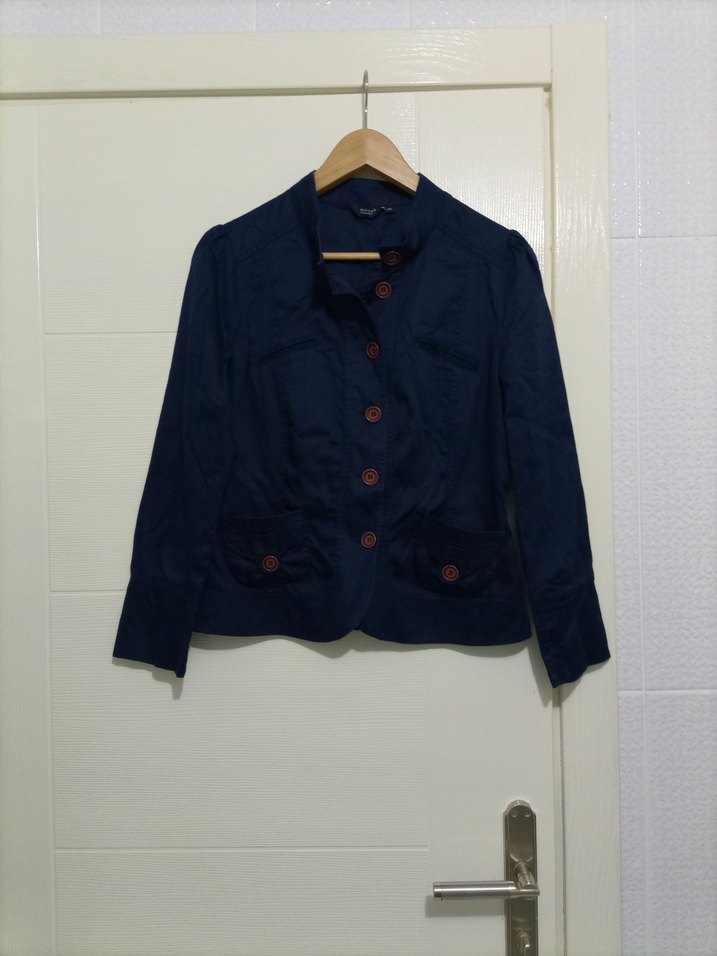 Uzun kollu, düğmeli, normal uzunlukta lacivert keten blazer. Ofis ve günlük sokak stiline uygun, rahat kesim ve klasik yaka detaylı.