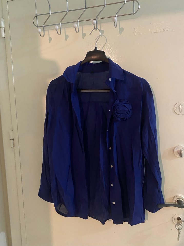 Düğmeli önü, yakalı ve uzun kollu bu lacivert keten gömlek, bol kesimiyle rahat bir kullanım sunar. Midi boy ve sade tasarımı günlük sokak stiline uygundur.