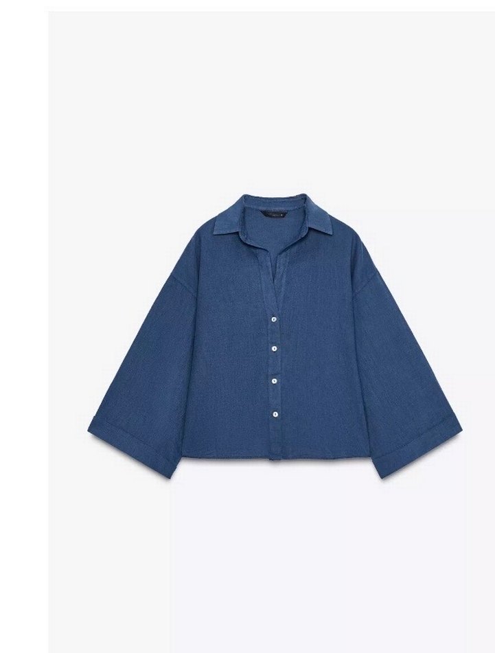 Lacivert keten kumaştan, düğmeli, uzun kollu, bol kesim ve kayık yaka detaylı, minimalist tarzda günlük kullanıma uygun kadın gömleği.2 kere giyildi