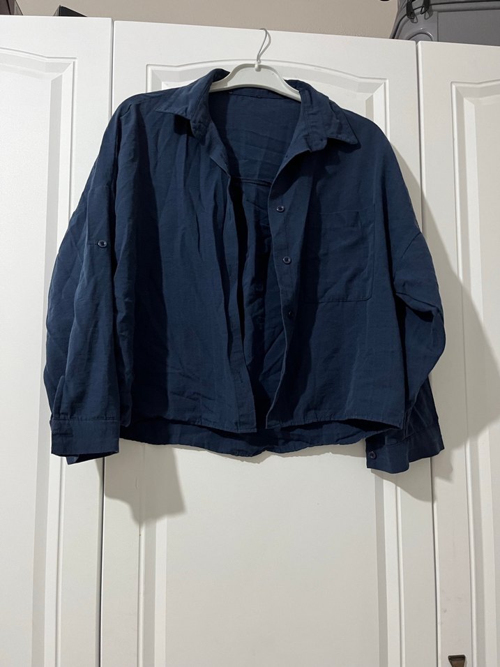 Lacivert keten kumaştan, düğmeli, not kesim yakalı, uzun kollu, bol kesim kadın gömlek. Minimalist ve sade tasarımıyla günlük kullanıma uygun.