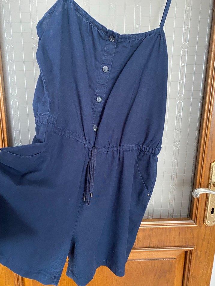 Lacivert parlak keten kumaştan, düğmeli, askılı kollu, gevşek kesim ve kesik yakalı kadın tulumu. Günlük rahat bohem tarzı sunar. Orjinal marka az kullanılmış askı ayarlana boyu ayarlanabilir