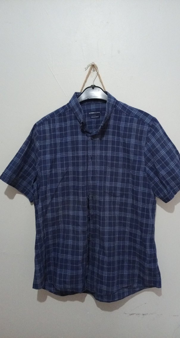 Lacivert ve gri tonlarda keten kumaştan yapılmış, kısa kollu, düğmeli ve klasik kesim erkek gömleği. Günlük ve sokak tarzına uygundur.
