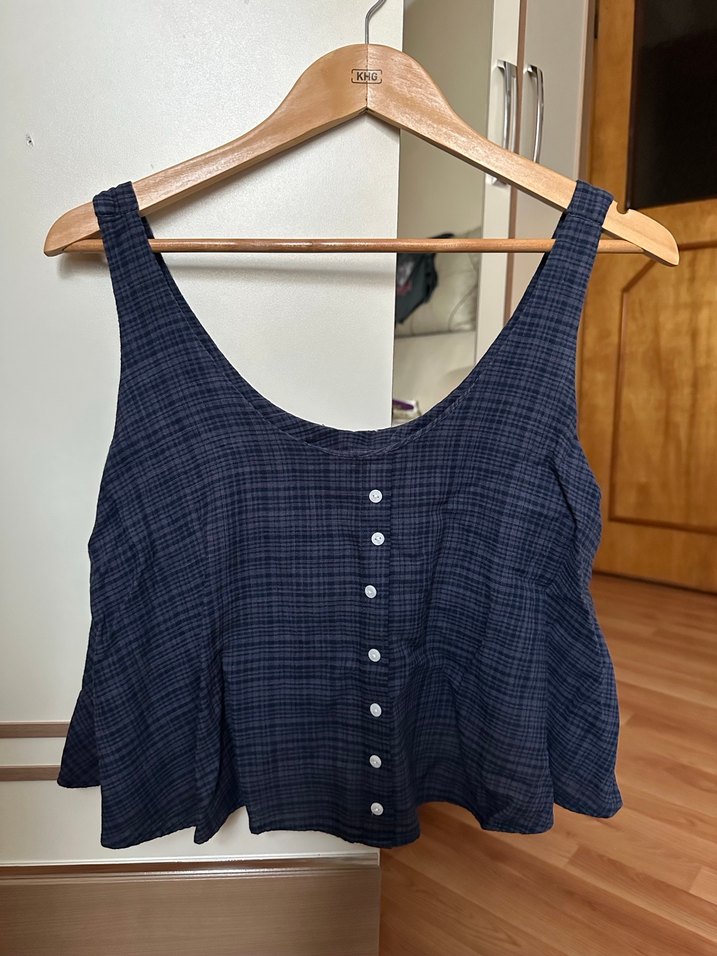 Düğmeli, lacivert keten kumaştan yapılmış, salaş kesim askılı bluz. Günlük sokak stiline uygun.