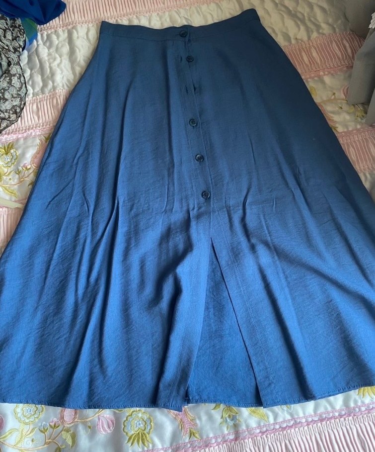 Düğmeli ön kısmı ve yumuşak keten kumaşıyla lacivert uzun etek, bol kesim ve bohem tarzıyla günlük kullanıma uygundur.