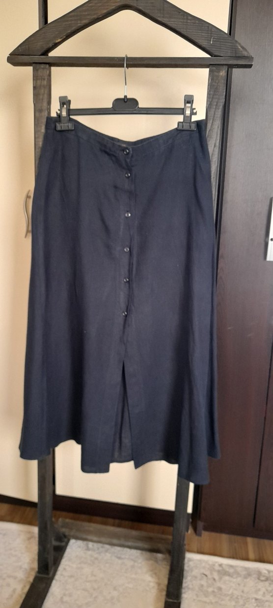 Lacivert renkte, düğmeli uzun keten etek. Rahat kesimi ve sade deseniyle ofis için uygundur, gotik tarzı yansıtır.