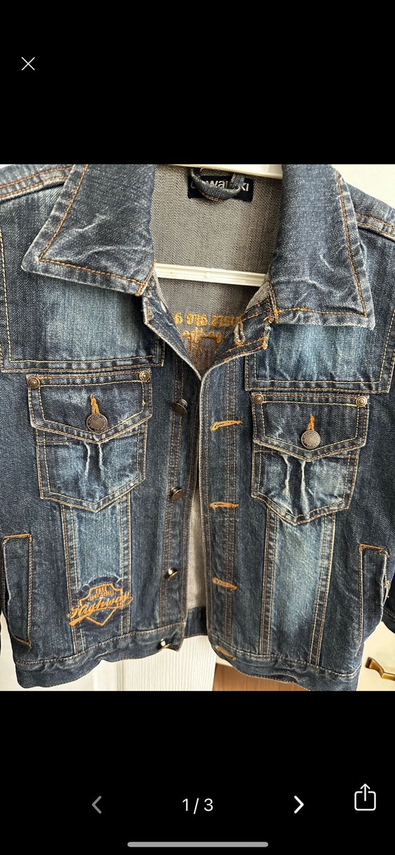 Lacivert renkte, kısa kollu, düğmeli kot ceket. Normal boyda ve fitted kesim, nakış detaylarıyla günlük sokak stiline uygun.