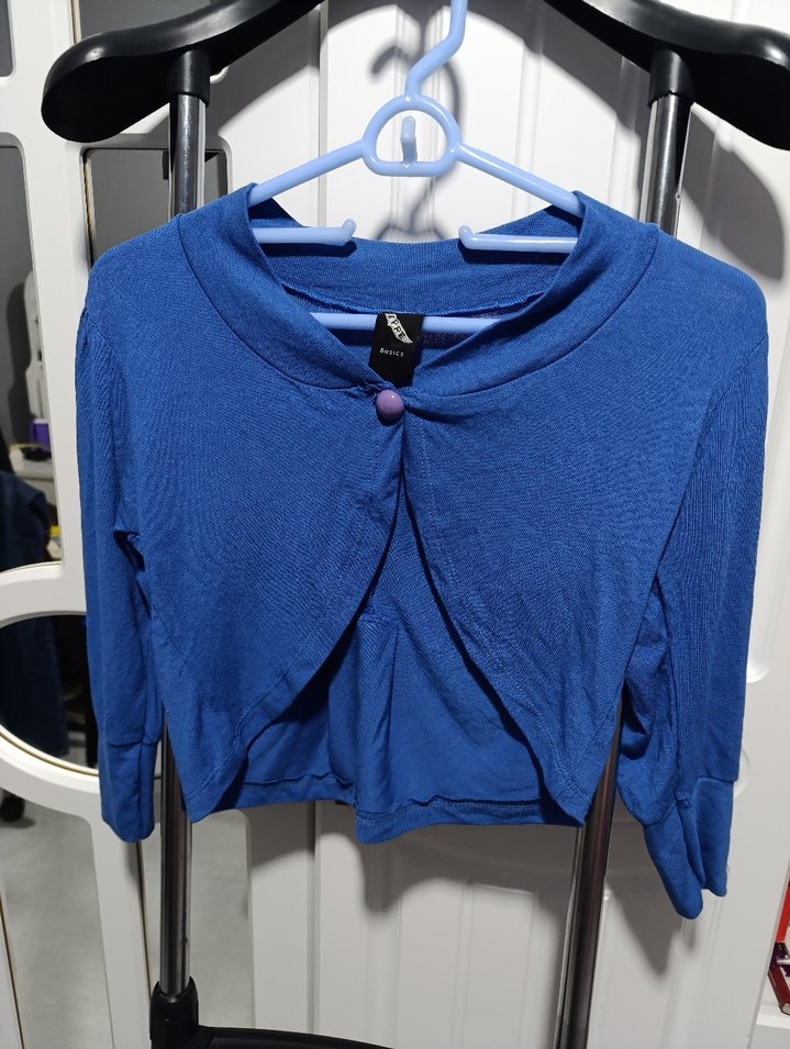 Kızlar için düğmeli, uzun kollu, bisiklet yakalı, fitted kesim lacivert bolero. Yumuşak ve sıcak kumaştan üretilmiştir, trend sokak tarzına uygundur.