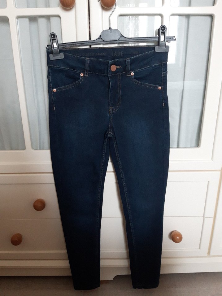 Düğmeli, lacivert kot kumaştan yapılmış, klasik skinny kesim dar paça jeans.Kilo:48 Boy: 1.55