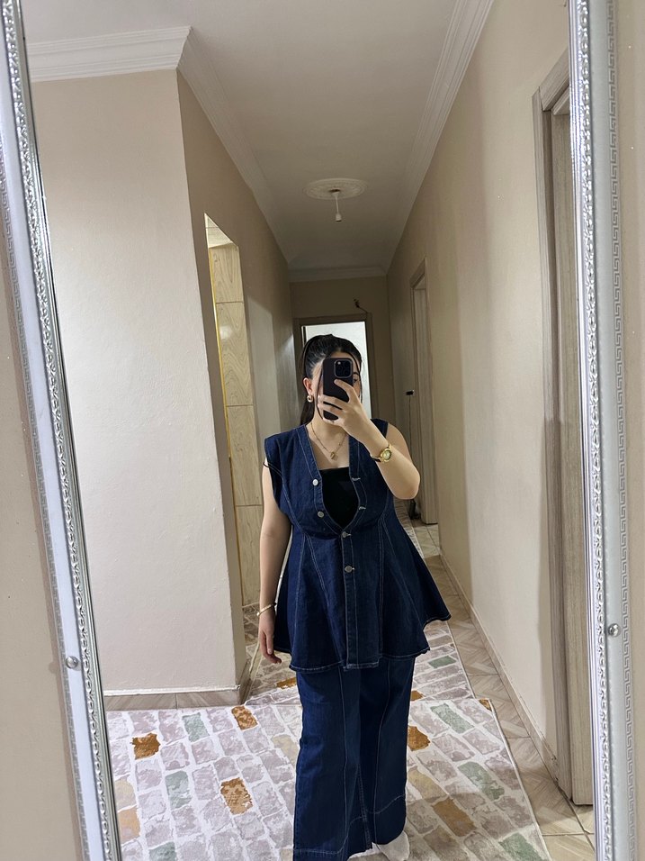 Düğmeli ön kısmı, V yaka ve kolsuz tasarımıyla lacivert, parlak tie-dye desenli kadın denim cekettir. Rahat kesimdir ve günlük şıklık sunar.